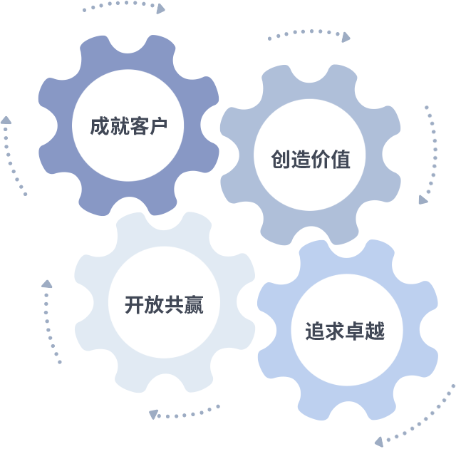 成就客户是一切决策的出发点,创造价值是衡量所有工作的标准,追求卓越是壹号娱乐做事做人的态度,开放共赢是壹号娱乐的格局也是最终的结果。价值观的齿轮环环相扣,推动着组织里的每个人不断向前。